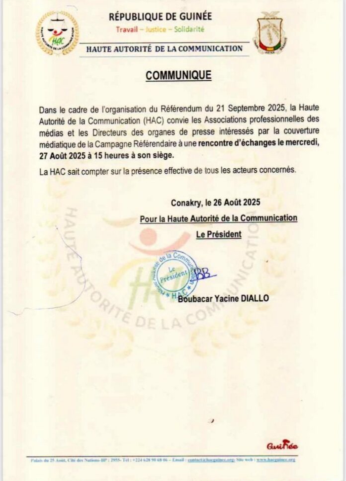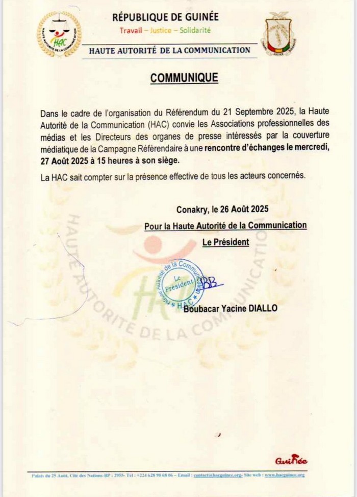 À LA UNEcommuniqué Référendum du 21 septembre : La HAC convie les patrons des médias à une rencontre ( Communiqué) By admin - 27 août 2025 FacebookXPinterestWhatsApp
