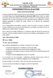 Le Bureau syndical dénonce également l’absence de publication du rapport relatif au dossier FUGAS, portant sur les primes de session des travailleurs. Ce dossier, qualifié de « légitime et urgent » par les représentants syndicaux, reste sans suite à ce jour, alimentant davantage le mécontentement au sein du personnel parlementaire.
